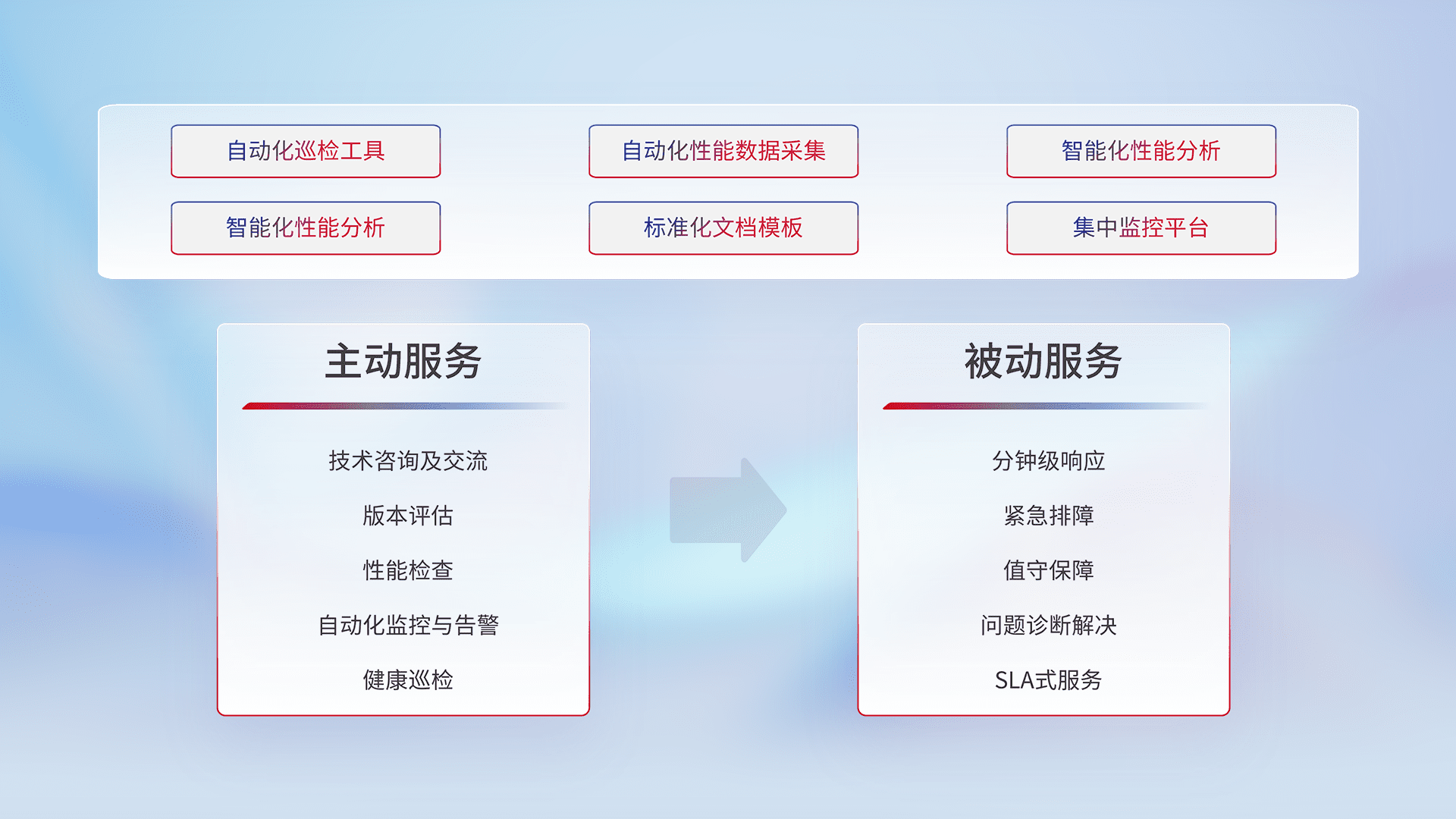 智能化工具和标准化文档,,保障服务质量,,提供主动服务(包含技术咨询、、、、版本评估、、性能检查、、、自动化监控与告警、、健康巡检)和被动服务包含(分钟级响应、、、、紧急排障、、、值守保障、、、、问题诊断解决、、、SLA服务)。。。。